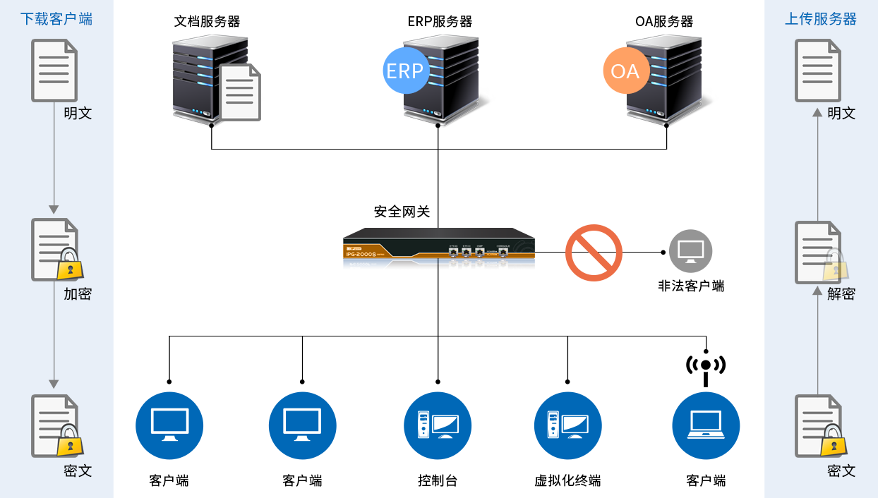 安全網(wǎng)關(guān)結(jié)合IP-guard加密客戶端,對(duì)服務(wù)器重要數(shù)據(jù)進(jìn)行保護(hù)